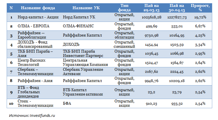 Десятка доходных ПИФов апреля29.12.2016Как показывает статистика, в апреле наблюдался приток средств в размере 4,6 млрд руб., в то время как в марте был зафиксирован их отток в размере 1,34 млрд руб. При этом наибольшие потери вновь понесли ПИФы, состоящие из акций, однако чуть... |
