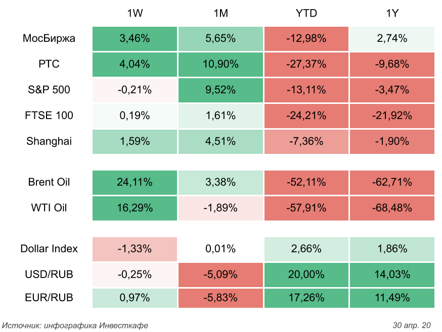 Рынок не справится с давлением нефти27.04.2020Сессия 24 апреля на отечественном рынке завершилась в минусе. Объем торгов был на 30% ниже среднего за 30 дней и составил 64 998 млн руб. В лидерах роста были Тинькофф Банк (+3,31%), Полюс (+1,2%) и Фосагро (+0,52%). Список... |