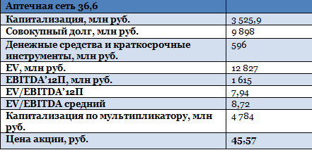 При расчете справедливой цены больший вес получили иностранные аналоги, работающие в фармацевтическом ритейле, мультипликаторам российских компаний придан вес 30%, так как они в большей степени ориентированы на производство лекарств. Справедливая цена по акциям Аптек 36,6 составляет 45,57 руб., потенциал роста — 29%, однако в ближайшем будущем достижение справедливой цены маловероятно.