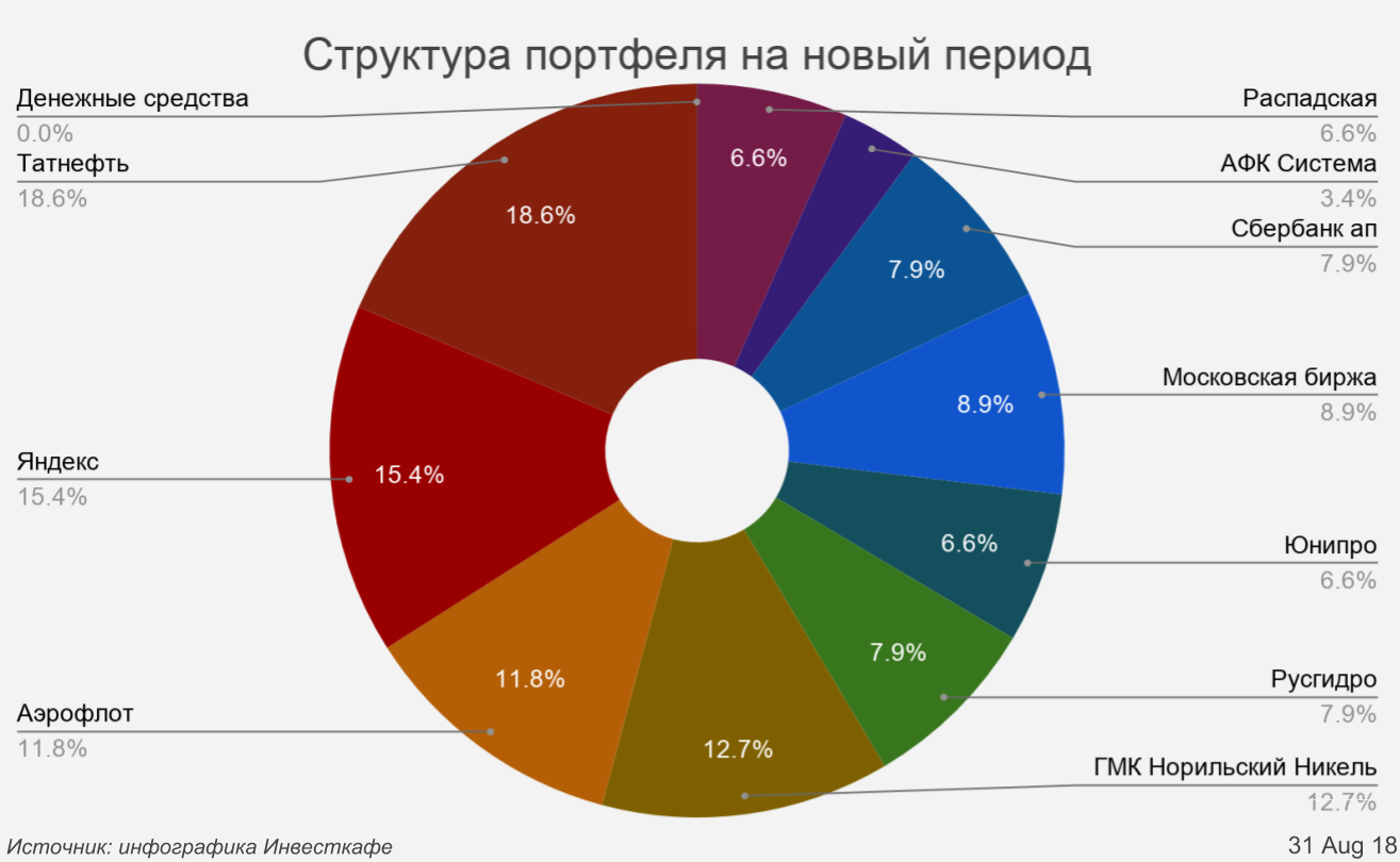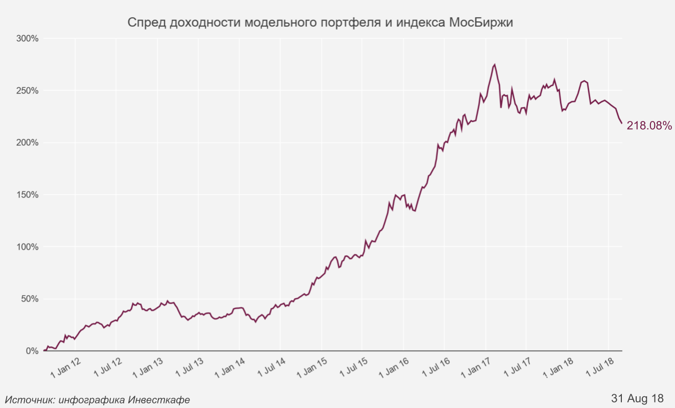 С 17 по 31 августа совокупные активы нашего модельного портфеля подорожали на 0,2% при росте индекса МосБиржи на 4,02%. Спред (разрыв в доходности) между ними с начала отчета сузился и составил 218,08 п. в нашу пользу.
