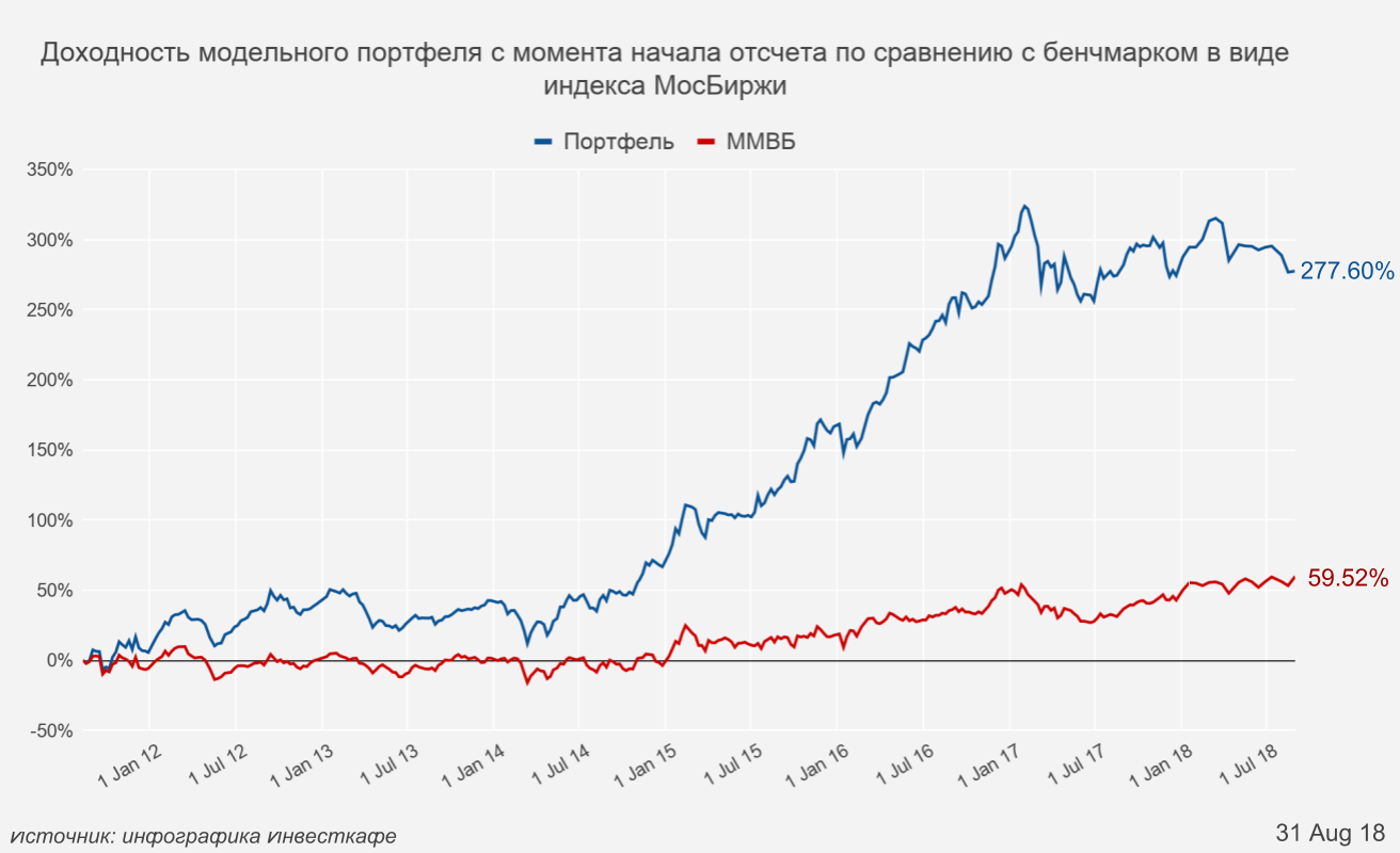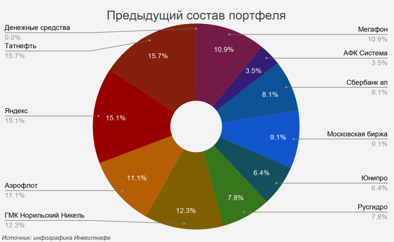 Модельный портфель Инвесткафе формируется на основании рекомендаций отраслевых аналитиков агентства, которые предлагают наиболее интересные акции по соотношению риск/доходность из списка самых ликвидных бумаг отечественного фондового рынка. Вес каждой бумаги в портфеле определяется на основании потенциала ее роста, рассчитанного методами фундаментального анализа и скорректированного на индивидуальные риски эмитента. Цены, по которым будут производиться сделки, берутся по состоянию на закрытие пятницы либо другого последнего дня торговой недели. Начальная стоимость портфеля составляла немногим более 960 тыс. руб. Дата составления первого модельного портфеля по вышеописанному методу — 12 августа 2011 года.