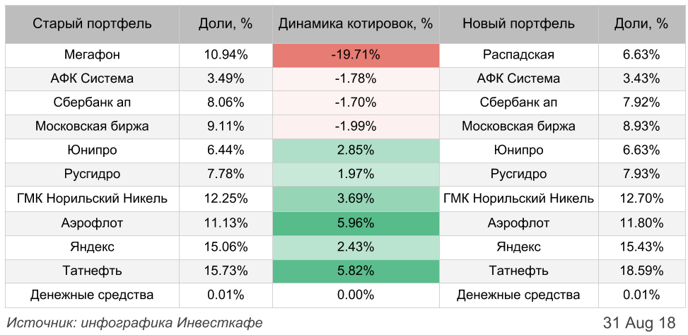 С 17 по 31 августа стоимость совокупных активов модельного портфеля (акции + кэш) выросли менее, чем индекс Московской биржи. Ключевой причиной стала сильная просадка Мегафона, который исключается из портфеля.