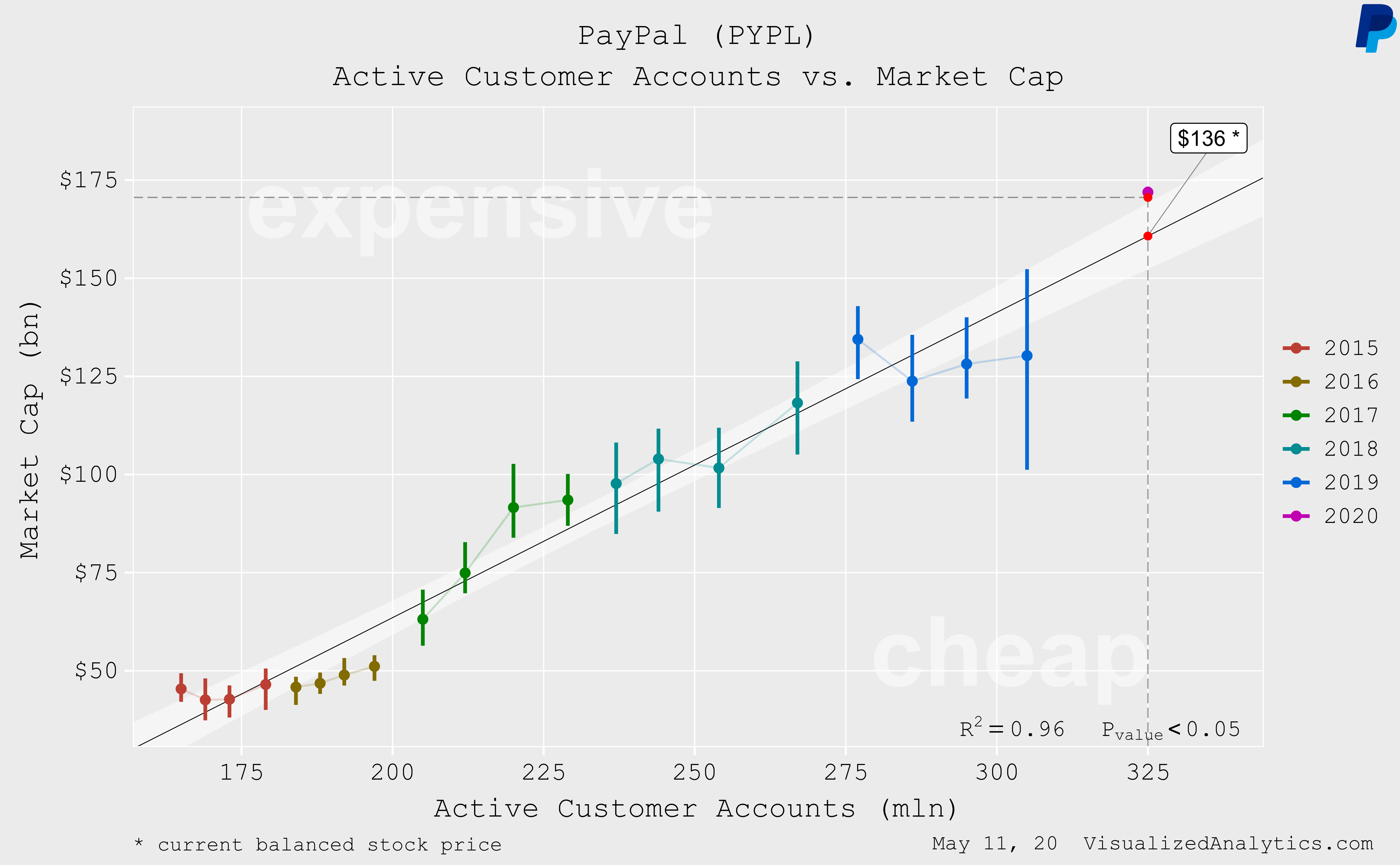 Однако возникает вопрос, отражает ли текущая цена акций PayPal продемонстрированный рывок базы пользователей компании. Для ответа на этот вопрос нужно изучить зависимость между капитализацией компании и количеством его активных аккаунтов. Полученная таким образом модель достаточно релевантна для анализа (R2=0,96).