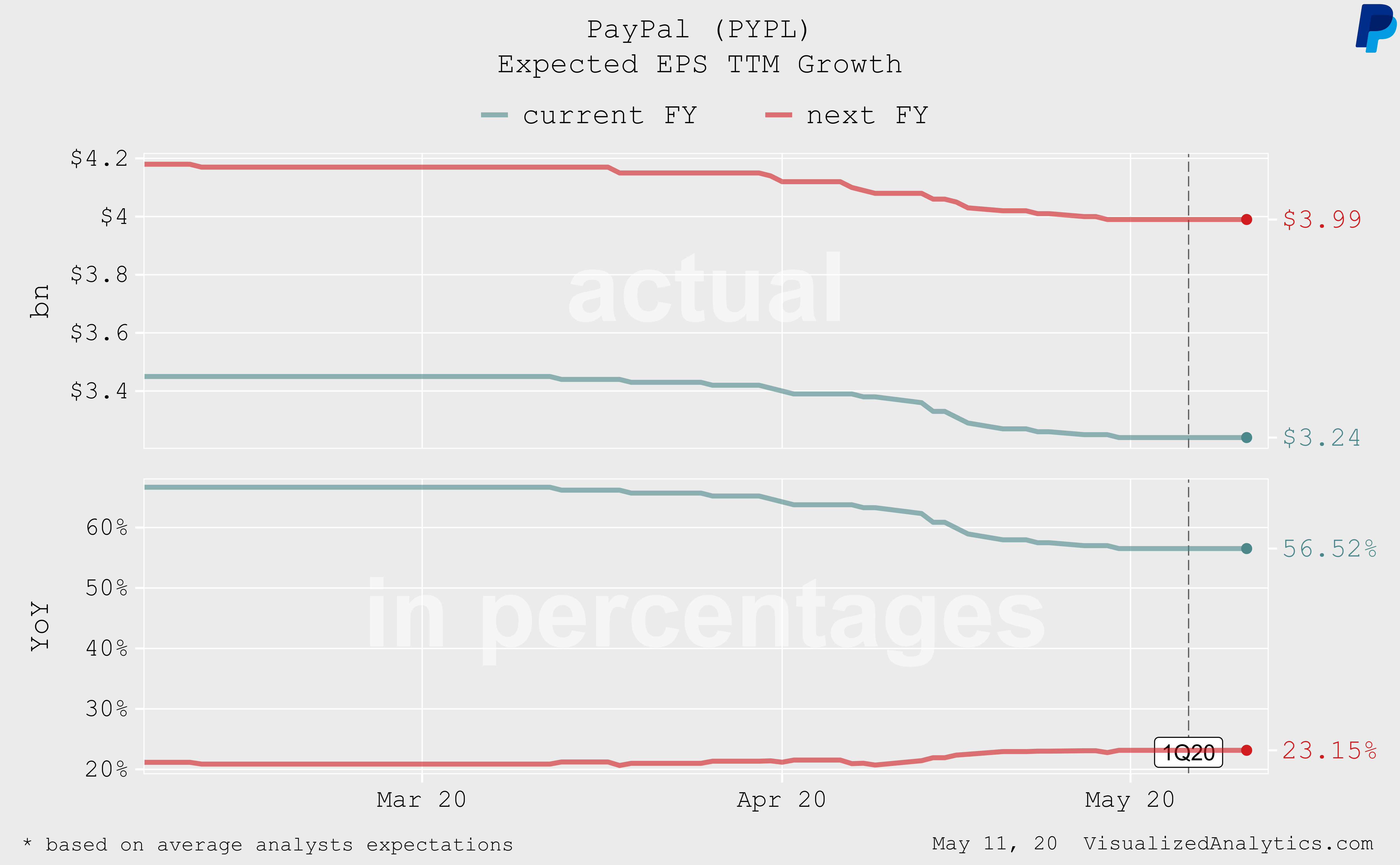 Первый квартал формально выдался для PayPal неудачным. Выручка компании составила $4,618 млрд, недотянув до консенсуса ожиданий $99,25 млн. Прибыль на акцию составила $0,07, что оказалось исторически худшим результатом и также не оправдало общерыночные прогнозы. Стоит отметить, что после публикации отчета средние ожидания аналитиков относительно ключевых итоговых результатов PayPal в текущем и будущем фискальном году практически не изменились.