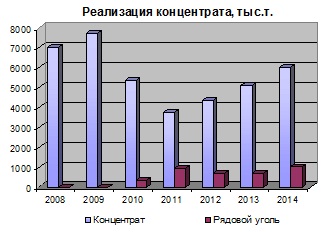 Что касается средневзвешенных цен реализации концентрата за 12 месяцев 2014 года, то они в рублевом эквиваленте снизились на 9%, прежде всего за счет неблагоприятной рыночной конъюнктуры на мировом угольном рынке, которая остается таковой уже в течение нескольких последних лет. Правда, стремительный рост курса доллара в 4-м квартале 2014 года несколько компенсировал падение цены, а по сравнению с уровнем 3-го квартала в рублевом выражении она даже повысилась.