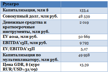 В 2013 году сахарный бизнес, скорее всего, покажет себя с лучшей стороны, так как наметился рост цен на внутреннем рынке. Однако рентабельность может быть ограничена ростом конкуренции, в том числе из-за увеличения импорта готовой продукции. Сегмент свиноводства будет продолжать находиться в сложном положении, поэтому, вероятно, рентабельность и стоимостной объем продаж будут падать. Если погодные условия в 2013 году не подведут, сельскохозяйственный сегмент покажет небольшое сокращение рентабельности за счет снижения цен, однако это не станет для Русагро критическим. Масложировой сегмент уже не будет расти такими большими темпами, как в 2012 году, если компания не будет покупать новые заводы, соответственно, можно ожидать его стабилизации. По моему мнению, рост выручки Русагро в 2013 году составит порядка 25%, рентабельность EBITDA компании будет на уровне 20-23%.