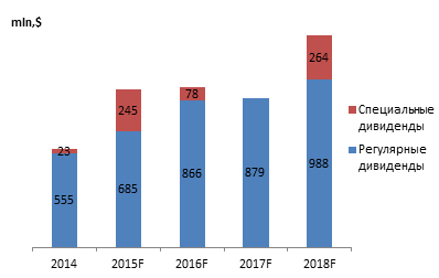 Не стоит забывать, что РУСАЛу принадлежит 27,8% акций ГМК Норникеля. По состоянию на конец сентября стоимость доли оценивалась в $8 209 млн, что более, чем на 80% покрывает чистый долг эмитента. Кроме того, компания Олега Дерипаски по итогам 9 месяцев 2014 года получила промежуточные дивиденды, размер которых составил 33,5 млрд руб. или $516,7 млн по текущему курсу. Всего за период с 2014-го по 2018 год РУСАЛ ожидает получить от Норникеля $4,5 млрд в виде дивидендов. Ниже представлен прогноз алюминиевого гиганта по дивидендам по годам.