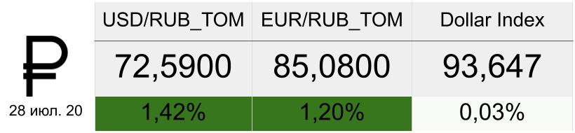 Индекс доверия потребителей США в июле опустился до 92,6 п. после 98,3 п. месяцем ранее. ФРС продлила действие некоторых антикризисных кредитных программ до конца года, что указывает на проблемы с восстановлением экономики. Американские фондовые площадки завершили торги вторника в минусе. На премаркете снижение продолжается.