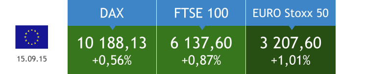 Положительное сальдо торгового баланса еврозоны в августе составило 31,4 млрд евро увеличившись с 26,4 млрд евро, зафиксированных месяцем ранее. Индекс потребительских цен Великобритании в августе вырос на 0,2% м/м и остался без изменений по отношению к предыдущему году, как и ожидалось. Европейские фондовые индексы завершили торги 15 сентября в плюсе, реагируя на хорошую статистику.