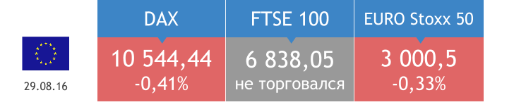 Индекс делового климата еврозоны в сентябре составил 0,45 п., превысив прогноз на 0,4 п. Индекс потребительских цен Германии в сентябре вырос на 0,1% м/м и на 0,7% г/г, в обоих случаях оказавшись выше ожидаемого на 0,1%, а безработица, как и предполагалось, осталась на уровне 6,1%. Индекс потребительской уверенности Великобритании в сентябре составил -1 п. после -7 п. месяцем ранее. Европейские площадки демонстрировали разнонаправленную динамику.