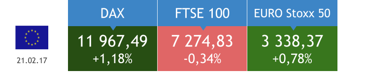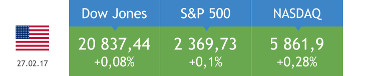 Индекс экономических условий в непроизводственной сфере США в феврале составил 57,6 п., превысив прогноз на 1,1 п. В пятницу в Чикаго глава ФРС Джанет Йеллен заявила, что Федеральная резервная система США может повысить процентную ставку в марте, если данные о состоянии рынка труда и инфляции останутся на приемлемом уровне. Американские биржевые площадки закрылись в небольшом плюсе.