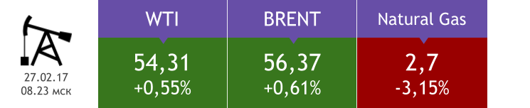 Цена на WTI 3 марта выросла на 1,3%, до $53,21, Brent подорожала на 1,39%, до $55,78. Нефть пытается вернутся в узкий диапазон, в котором она движется с января. Этому процессу способствует снижение курса доллара, но вряд ли этот фактор будет действовать долго, учитывая почти неминуемое повышение ставки ФРС 15 марта.