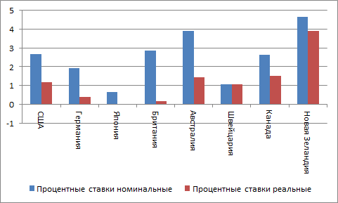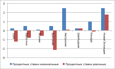 Таким образом, в условиях восстановления особой популярностью должны пользоваться рискованные валюты. Для того чтобы понять, какие инструменты валютного рынка к ним следует относить, следует оценить текущие значения номинальных и реальных (скорректированных на величину инфляции) процентных ставок.