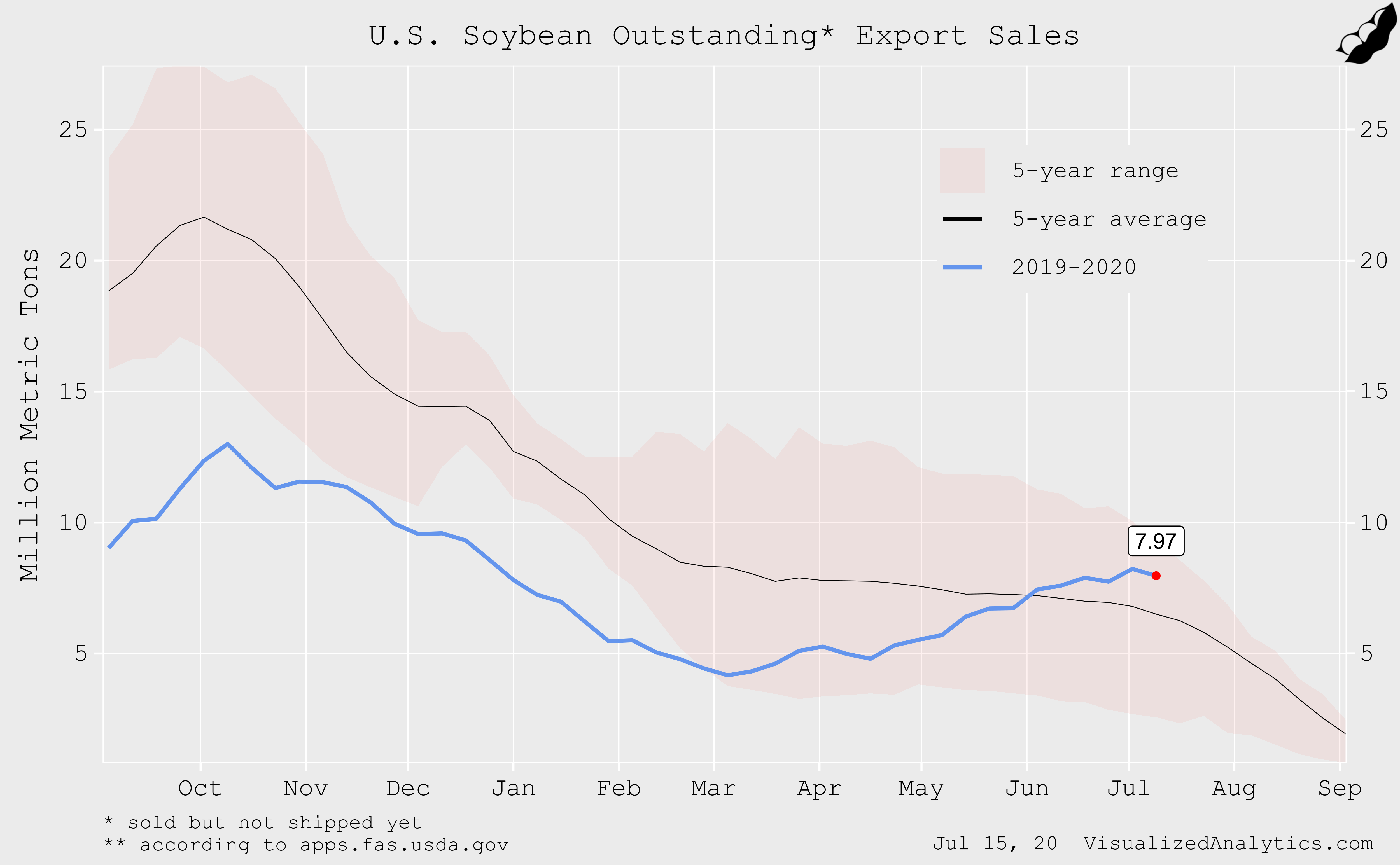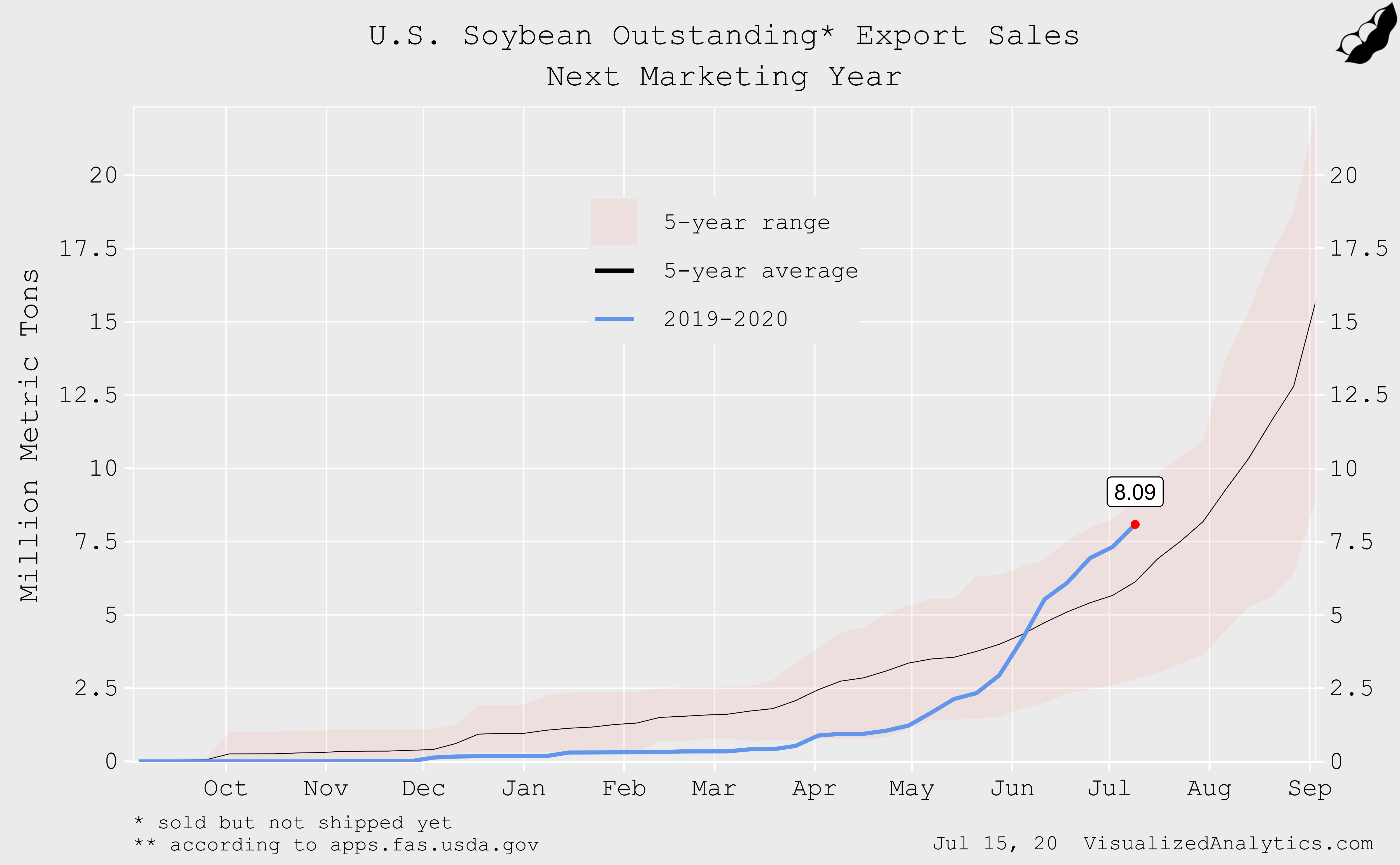 А отложенные продажи на будущий маркетинговый год, который для сои начнется в сентябре, уже приближаются к рекордным уровням.