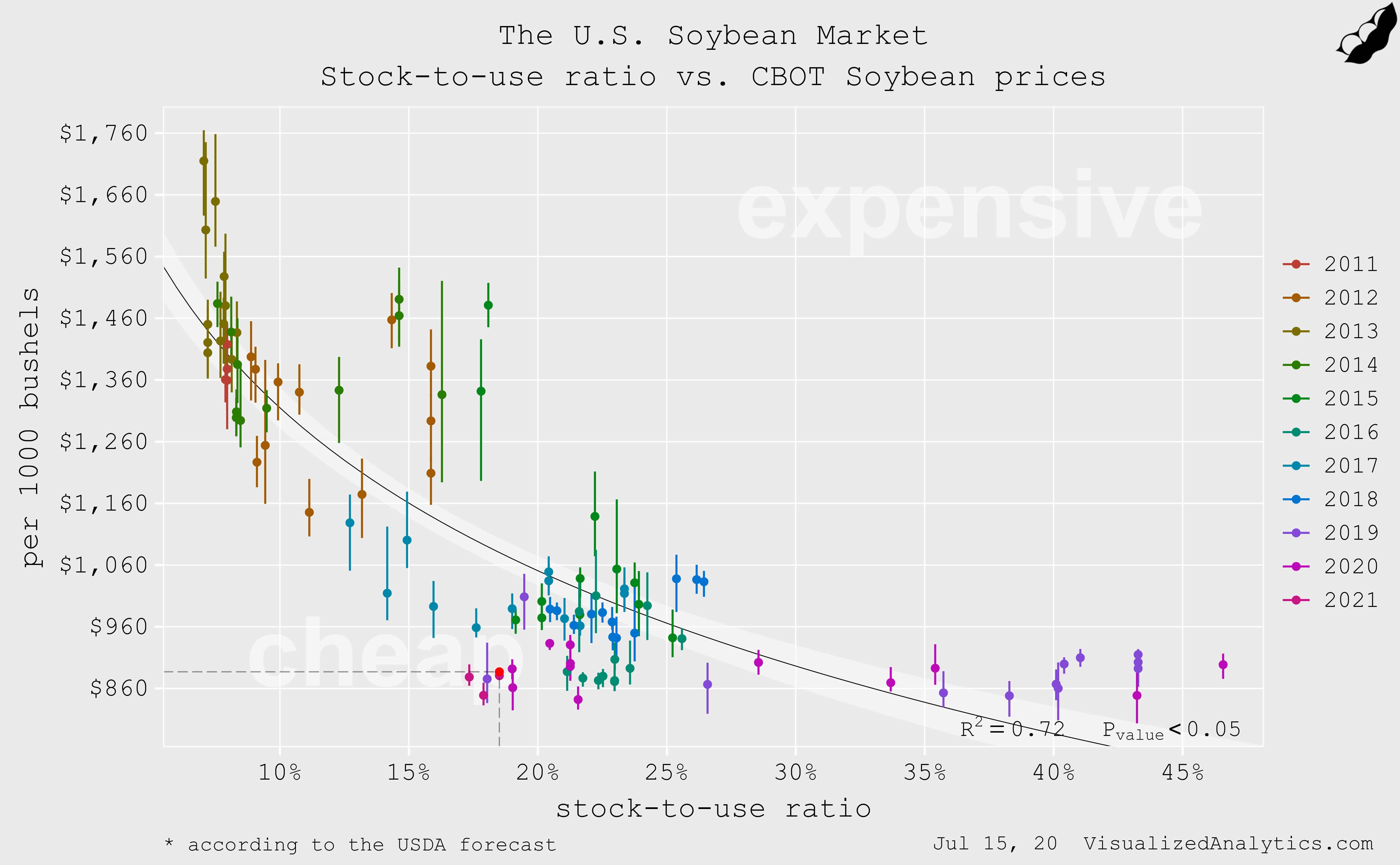 Теперь давайте посмотрим, насколько текущее состояние рынка сои в США готово к усилению спроса из-за рубежа. Одним из лучших маркеров баланса спроса и предложения на рынке сои является коэффициент stock-to-use, поскольку он одновременно учитывает и остатки, и спрос. Кстати, этот коэффициент формирует качественную долгосрочную зависимость с фьючерсной ценой на сою. А эта зависимость позволяет определить справедливую цену товара. И судя по последним данным USDA, текущее значение stock-to-use для рынка США указывает, что цена фьючерса минимум на 15% ниже сбалансированной.