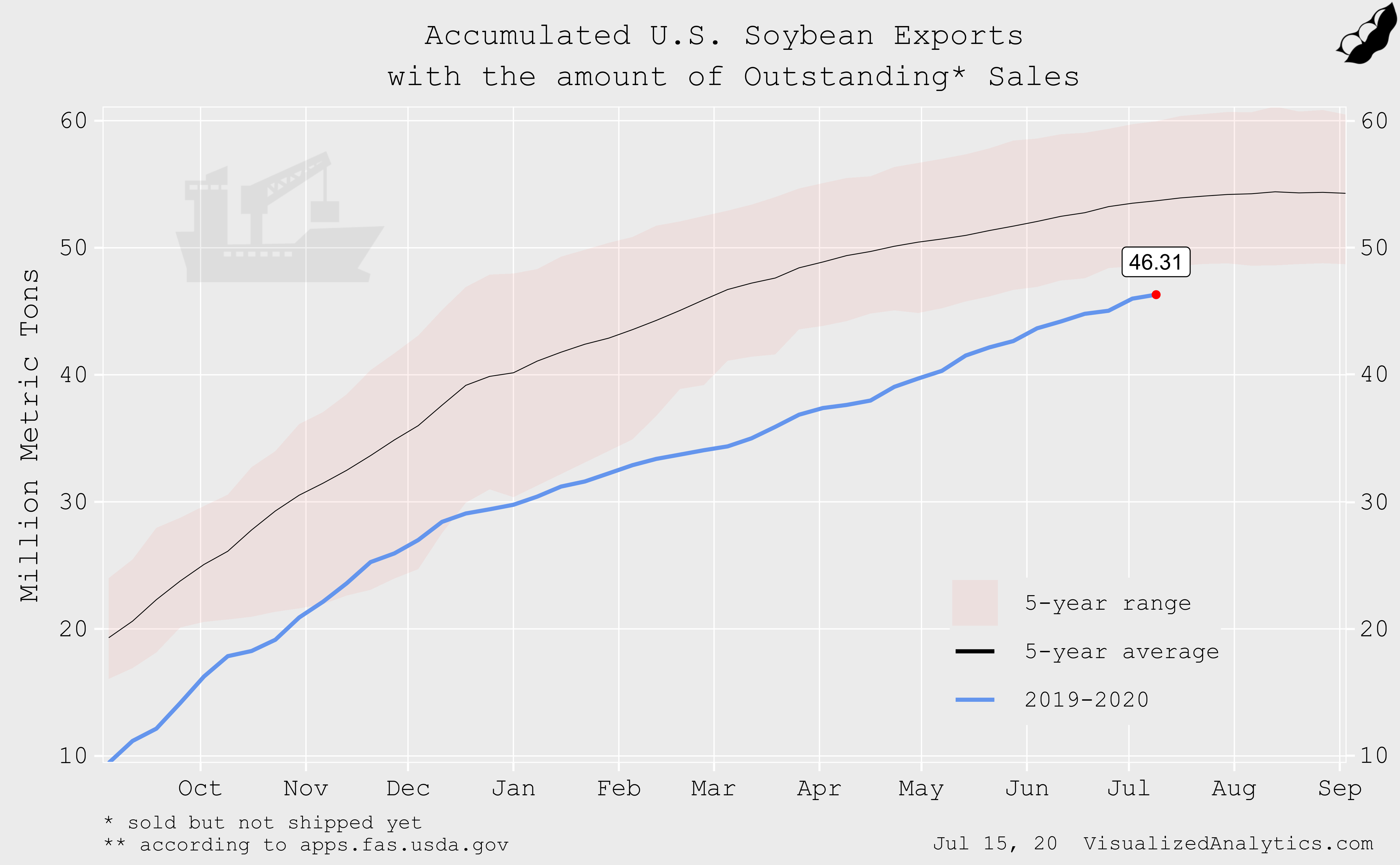 По данным USDA, на вторую неделю июля суммарный экспорт сои из США с учетом отложенных продаж (куплен, но не поставлен) составил 46,31 млн тонн. Это худший показатель за последние пять лет.