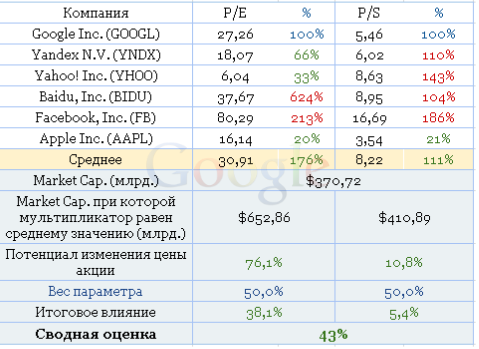 Если рассматривать потенциал акций Google сквозь призму соотношения основных мультипликаторов компании к конкурентам по отрасли, отмечаем стабильный потенциал к росту.