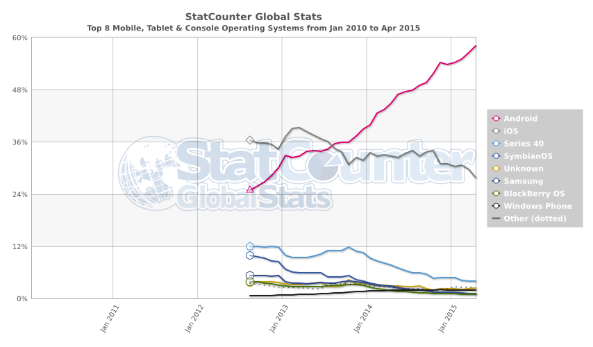 Согласно исследованию Spencer Trask&Co, в конце прошлого года количество активных мобильных девайсов превысило численность населения Земли. При этом темп роста числа смартфонов, планшетов и мобильных телефонов в 5 раз превысил темп роста численности людей на земном шаре. Ничто, созданное человеком, не распространялось так стремительно как мобильные телефоны: за 30 лет с нуля до 7,2 млрд! Что же касается их программного обеспечения, то можно с большой долей уверенности дать прогноз на ближайшие 5 лет: Android — 70%, iOs — 25%, другие — 5%.