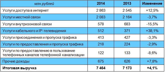 Выручка компании выросла в годовом выражении на 4,1%, до 7,5 млрд руб. Основную часть доходов Таттелекома (35,6%) по-прежнему формируется за счет услуг местной и внутризоновой стационарной телефонной связи, а также за счет предоставления широкополосного доступа к Интернету (38,4%). При этом доля выручки от предоставления местных телефонных соединений продолжает снижаться: если в 2013 году на нее приходилось 30,2% от всего оборота компании, то по итогам 2014 года эта статья сгенерировала 27,9% выручки, удержавшись немногим выше 2 млрд руб. В абсолютном выражении динамика доходов от этого сегмента выглядит ничуть не лучше, показывая снижение уже четвертый год кряду.