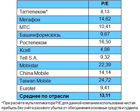 По сравнению с другими бумагами телекомов акции Таттелекома на сегодняшний день выглядят очень привлекательно и в долгосрочной перспективе могут обеспечить неплохую доходность. Мультипликатор P/E, скорректированный на убыток от обесценения основных средств и гудвила, принимает значение 8,13х при среднем по рынку 13,11х, открывая неплохие шансы для роста котировок в среднесрочной и долгосрочной перспективе.