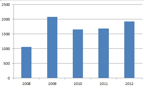 Динамика спроса на платину в сфере ювелирного дела в Китае в 2008-2012 годах, тыс. унций