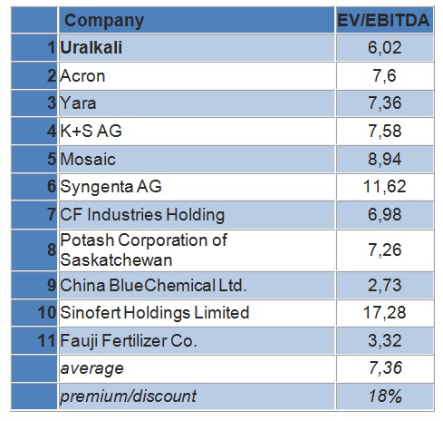 Судя по мультипликатору EV/EBITDA, Уралкалий торгуется на уровне 6,02x с 18%-м дисконтом к общей выборке компаний-аналогов. К прямому конкуренту компании Акрон, которая производит всю линейку минеральных удобрений, в том числе калийных, Уралкалий торгуется с дисконтом в 20%.