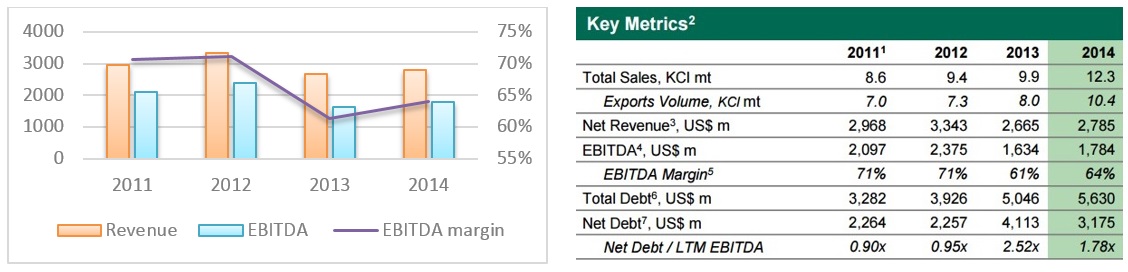 За последние 4 года компания стабильными темпами наращивала продажи калия за счет увеличивающегося спроса на калийные удобрения. Уралкалий по большей части экспортирует продукцию, продажи за рубеж составляют практически 85% от общего объема продаж, тем самым оставшиеся 25% идут на сбыт на внутреннем рынке. Судя по тому, что экспортная выручка превалирует, компания значительно выиграла от девальвации рубля. Однако в 2013-м и в 2014 году данный показатель Уралкалия просел за счет снижения цен на калий на мировых рынках и аварии на руднике Соликамск-2 (основное влияние данного фактора на производственные показатели произошло в 4-м квартале 2014 года), соответственно, EBITDA также снизилась. Маржинальность EBITDA за 2014 год была зафиксирована на уровне 64%, что является хорошим показателем рентабельности. Высокий показатель обоснован в силу уникальности природной базы (калийные месторождения в основном сконцентрированы в России и Канаде), высокой маржинальности производства калия по сравнению с прочими нутриентами, одного из самых дешевых производств калия в мире и оптимальной логистической структуры. За 2014 год Уралкалий продемонстрировал чистый убыток, но это произошло за счет FX потерь и удешевления стоимости свопов.