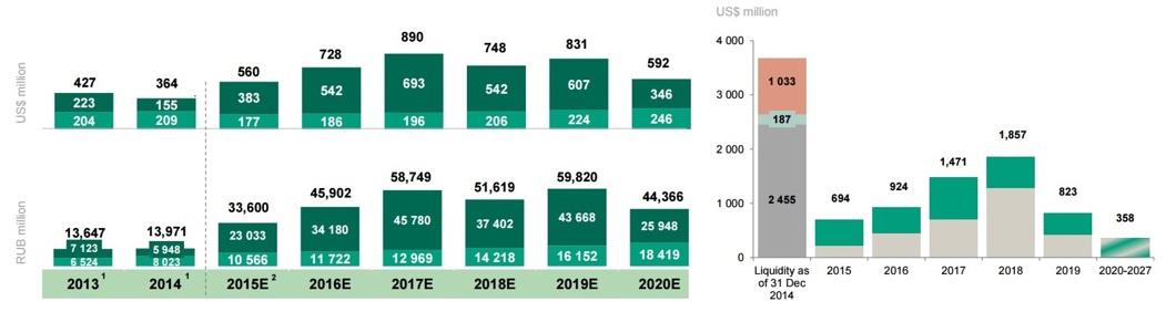 Что касается долговой нагрузки Уралкалия, то на конец июня 2015 года чистый долг составил $3,528 млрд. Соотношение чистого долга к EBITDA за последние 12 месяцев достигло 1,8х, что является невысоким показателем. Практически весь долг Уралкалия деноминирован в валюте, что создает некие риски — разрыв натурального хеджа составляет около 15%. Судя по графику погашения задолженности, компания не имеет проблем с ликвидностью за счет наличия денежных средств и доступных невыбранных кредитных линий.
